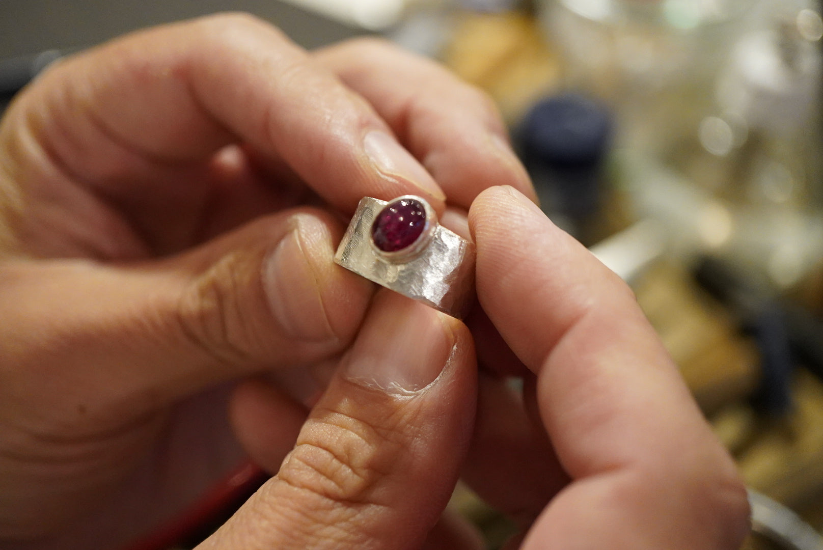 お母さまの誕生石のルビーを留めた